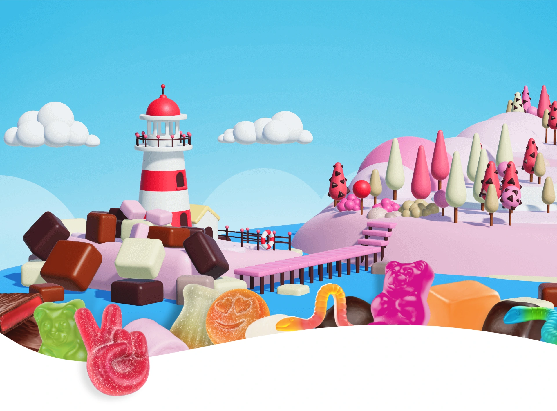 Assortment of colorful candies: gummy bears, gummy worms, a red peace sign gummy, and a fluffy purple vegan marshmallow.
