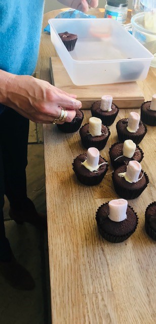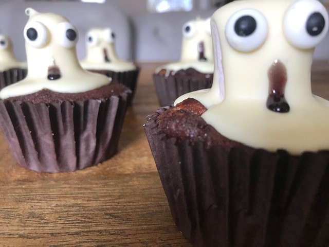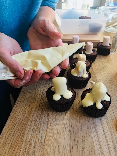 For the ghosts just a little pool around the bottom of the mallow and the snowman allow the chocolate to completely cover the cupcake top. Cool in the fridge for 10 minutes to set the chocolate before decorating with ready mixed icing.