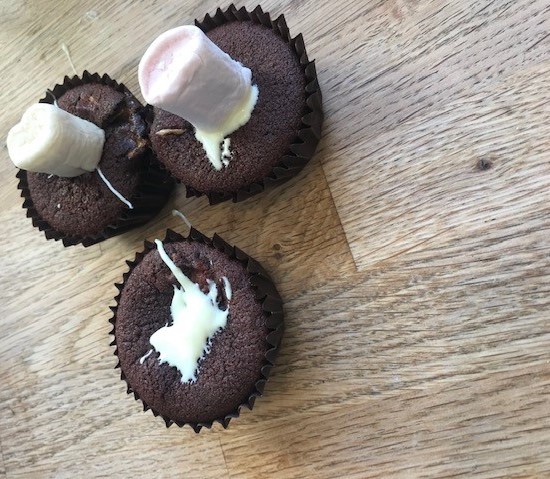 Now use a little melted chocolate to ‘glue’ your giant mallow to the top of the cupcake.