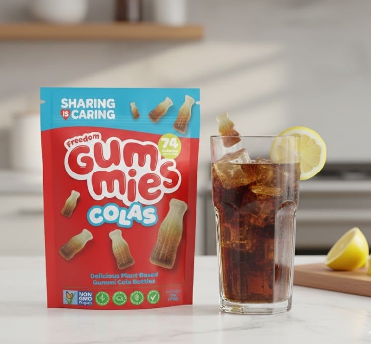 - Freedom Gummies “Colas”: Indulge in the timeless taste of cola with our plant-based cola bottles, Freedom Gummies “Colas”. Made without any animal-derived ingredients, they offer a deliciously fizzy and flavorful refreshing treat reminiscent of your favourite cola beverage.