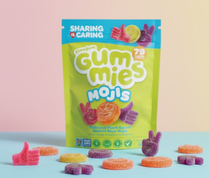 - Freedom Gummies “Mojis”: where every bite is an explosion of fruity goodness! Our delicious gummies come in a variety of mouthwatering flavors, including Lemon, Orange, Strawberry, and Raspberry. Get ready to embark on a flavor-filled journey that will leave your taste buds tingling with delight. Who says gummies have to be boring? Our gummies come in a variety of playful Moji shapes, adding a fun and whimsical twist to your snacking experience – from smiley faces with hearts to thumbs ups and peace signs, our emoji gummies are sure to put a smile on your face.