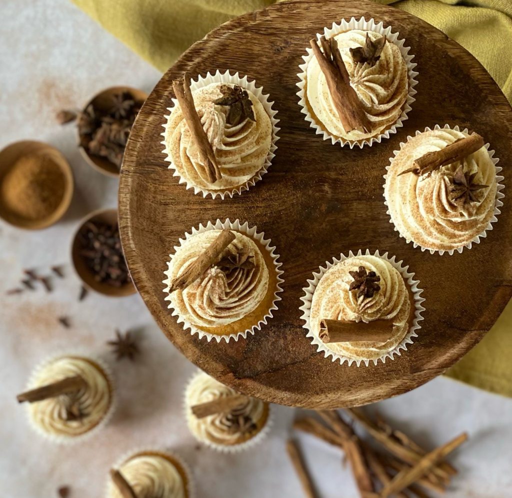 To make the frosting place the soft room temperature butter in a large bowl, whisk with a handheld electric mixer for at least 10 minutes until very pale and fluffy. Now add all the icing sugar and with a spatula and carefully mix to incorporate ( I do this under a tea towel to avoid a sugar cloud!) once most of the sugar is incorporated switch to a hand held mixer and beat for another 10 minutes until smooth. Add 2 tbsp of room temperature milk with the spices to make the mixture a little looser. All the ingredients for frosting must be room temperature to avoid curdling) Now squish out the air bubbles with a spatula against the sides of the bowl and scoop into a piping bag. Pipe a generous swirl on the top of each cupcake, then dust with cinnamon and decorate with star anise and cinnamon sticks.
