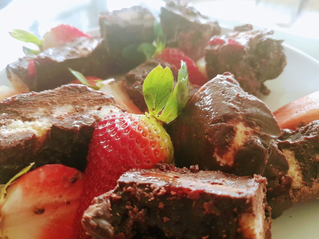 Start by boiling the kettle and place the hot water into a pan. Put a heat proof glass dish on top of the boiling water and melt the 300g Dark Moo Free Chocolate with the tbsp of coconut oil. Keep stirring with a spatula to help the chocolate melt and do not let it burn – there’s no saving burnt choc!