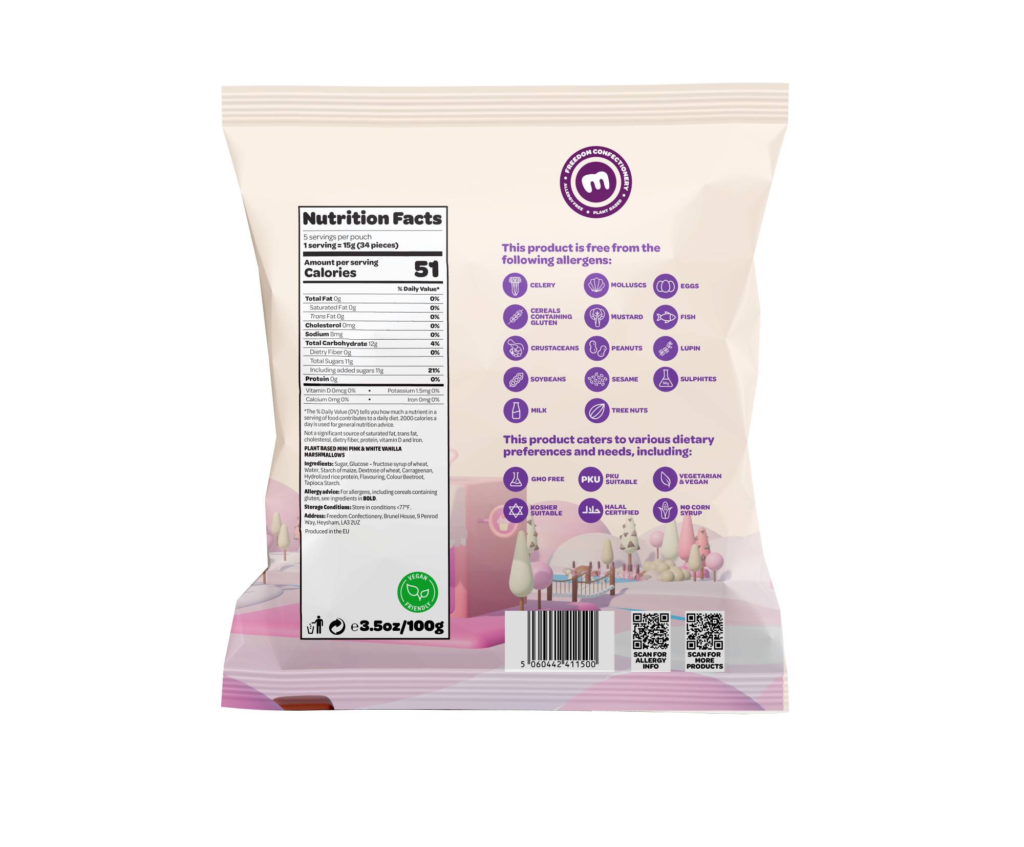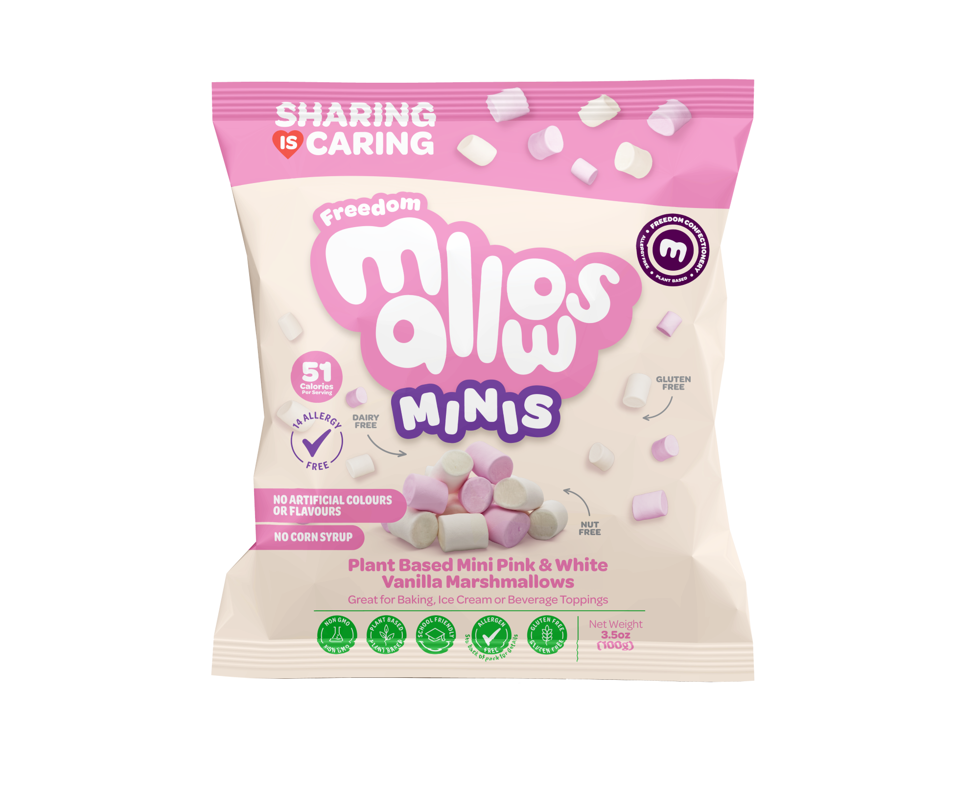 Freedom Confectionery offer The World’s Only All-Inclusive Marshmallows & Gummies – Leaving Nobody Out Whether Following an Allergen, Dietary, Religious or Lifestyle Diet. Freedom Confectionery’s Products are Plant Based; Top 14 Allergy Free-From*; Halal Certified; Kosher & PKU Suitable and made Without Artificial Flavours, Colours or Corn Syrup.