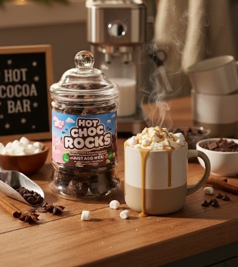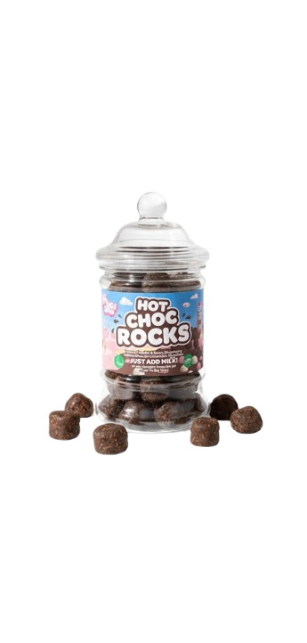 A brand new take on a classic hot chocolate! Indulge yourself in our brand new Hot choc rocks! A Creamy Toasted Vanilla & Sassy Strawberry Chewy Mallow Bite covered in Luxury Dark Chocolate. A taste explosion that will leave you wanting more! A hot chocolate for all the family, 4 servings in 1!