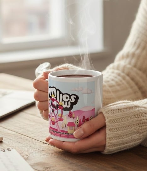 Take yourself off to MallowLand and let your fantasy begin, Hot Chocolate rivers, rolling down the Marshmallow Hills or join Cedric on the Helter Skelter. Your new Mug is super cool and will look Mallowtastic when drinking your Super Choccy hot chocolate bomb with Freedom Mini Pink & White marshmallow Topping.