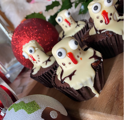 For the snowman allow the chocolate to completely cover the cupcake top. Cool in the fridge for 10 minutes to set the chocolate before decorating with ready mixed icing.